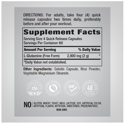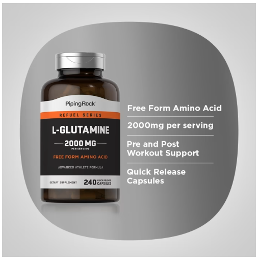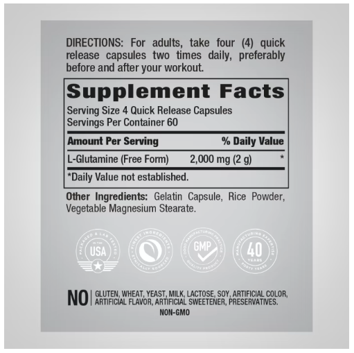 Amino nutrients are essential for a dynamic Sport’s Nutrition regiment. A quality L-Glutamine Supplement is the best way to achieve champion status! Which is why PipingRock delivers a potent, Free-Form Glutamine Supplement in Quick-Release capsules. Each serving provides 2000 mg of this incredible ingredient with no Artificial Flavor, Artificial Sweeteners or Preservatives. It’s also Non-GMO, Gluten-Free and backed by our commitment to purity, potency and bioavailability. Channel your inner champion with our L-Glutamine today!