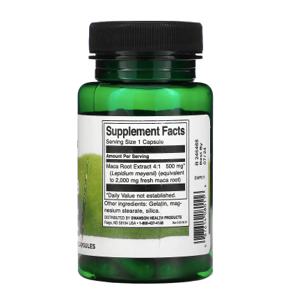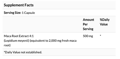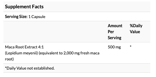 | Maca Root Extract 4:1 (Lepidium meyenii) (equivalent to 2,000 mg fresh maca root) | 500mg | Daily Value Not Established |